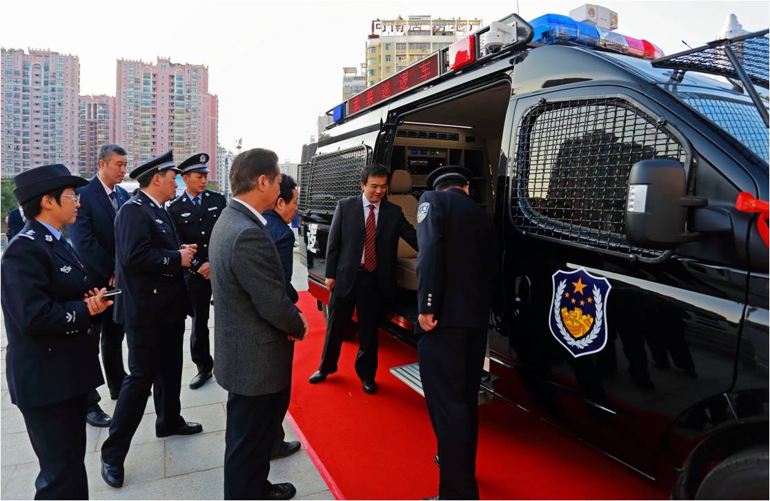 自治區(qū)公安廳和自治區(qū)財(cái)政廳相關(guān)領(lǐng)導(dǎo)共同見證了反恐武裝巡邏車的鑰匙交付過程。